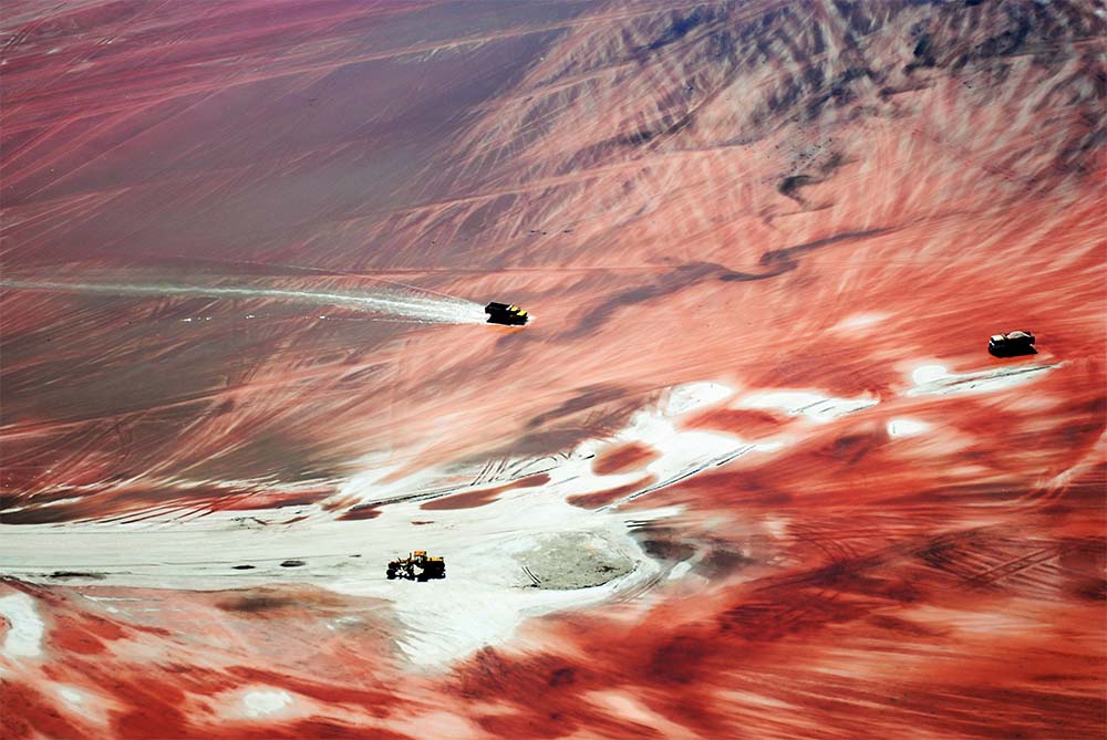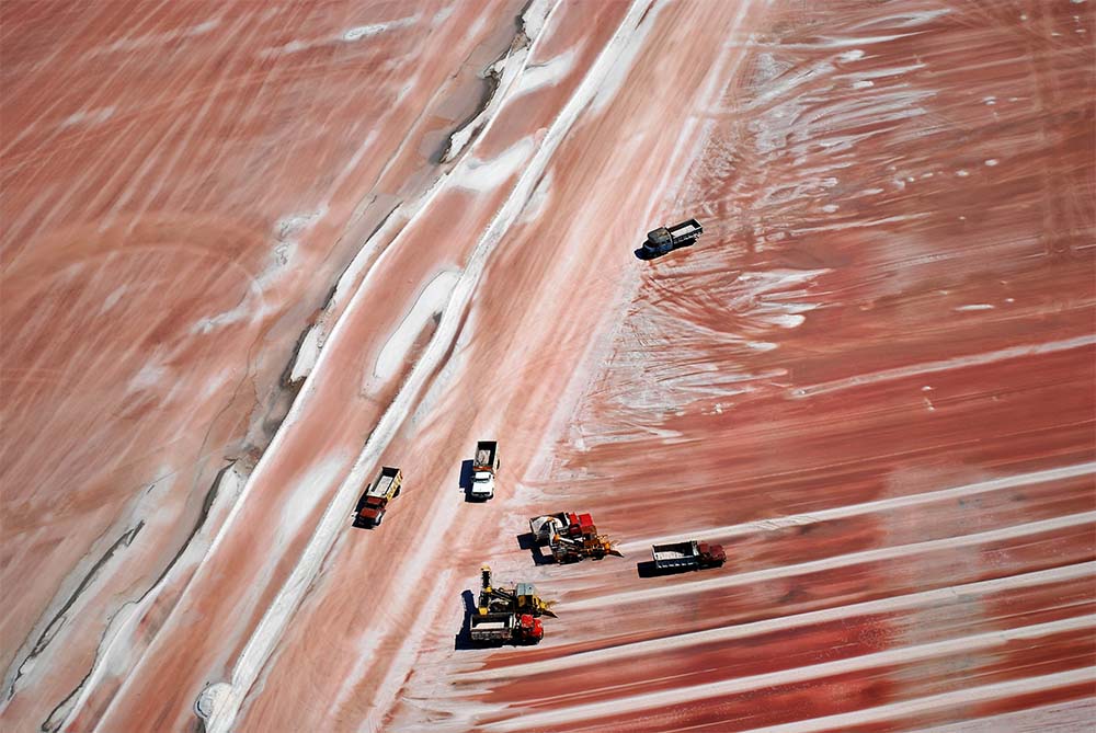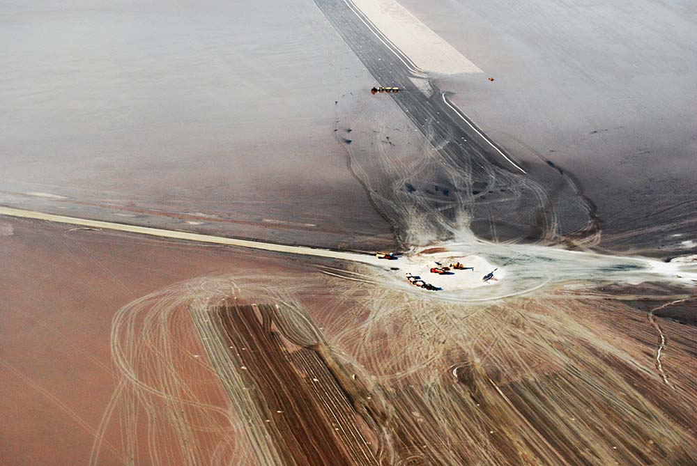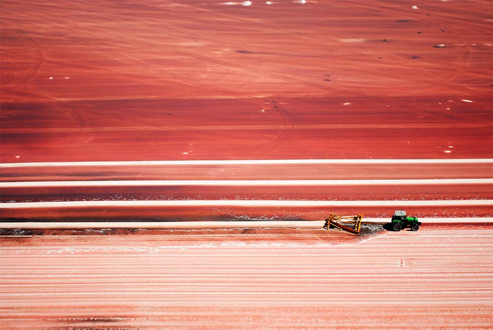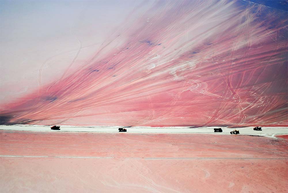 En época de cosecha de sal, los colores de la superficie lacustre cambian. El escaso nivel de agua, colonizado por millones de microscópicas artemias salinas, contrasta con el blanco del mineral. El operativo de extracción del Cloruro de Sodio es importante. Desde el avión, los movimientos y la distribución del trabajo invitan a componer.